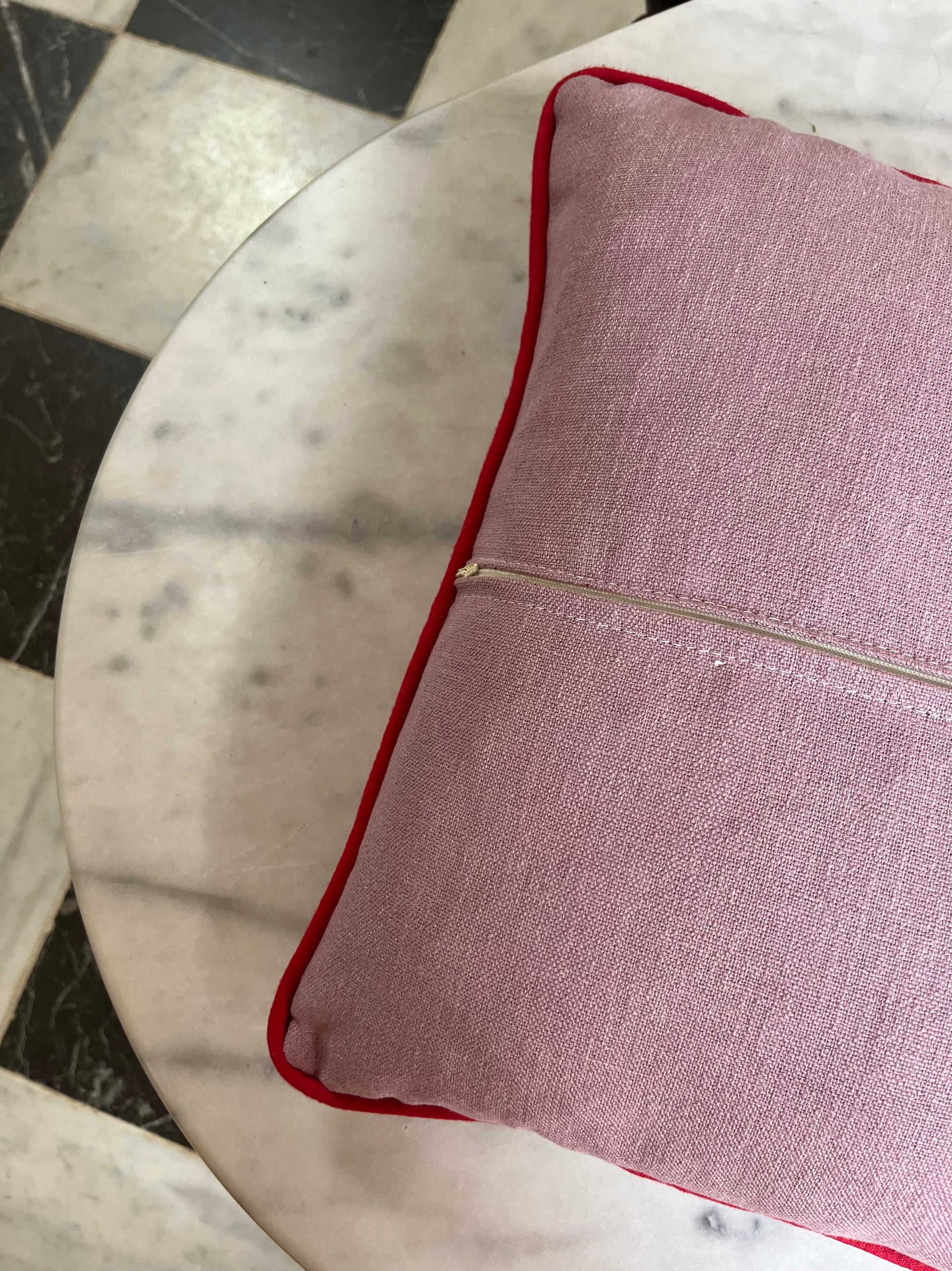 A handmade cushion covered in vintage Bernard Wardle 'Pomona' fabric. Paired with red linen piping, lilac contrasting back and finished with a zip fastening. This fun floral print adds a pop of colour to any room.