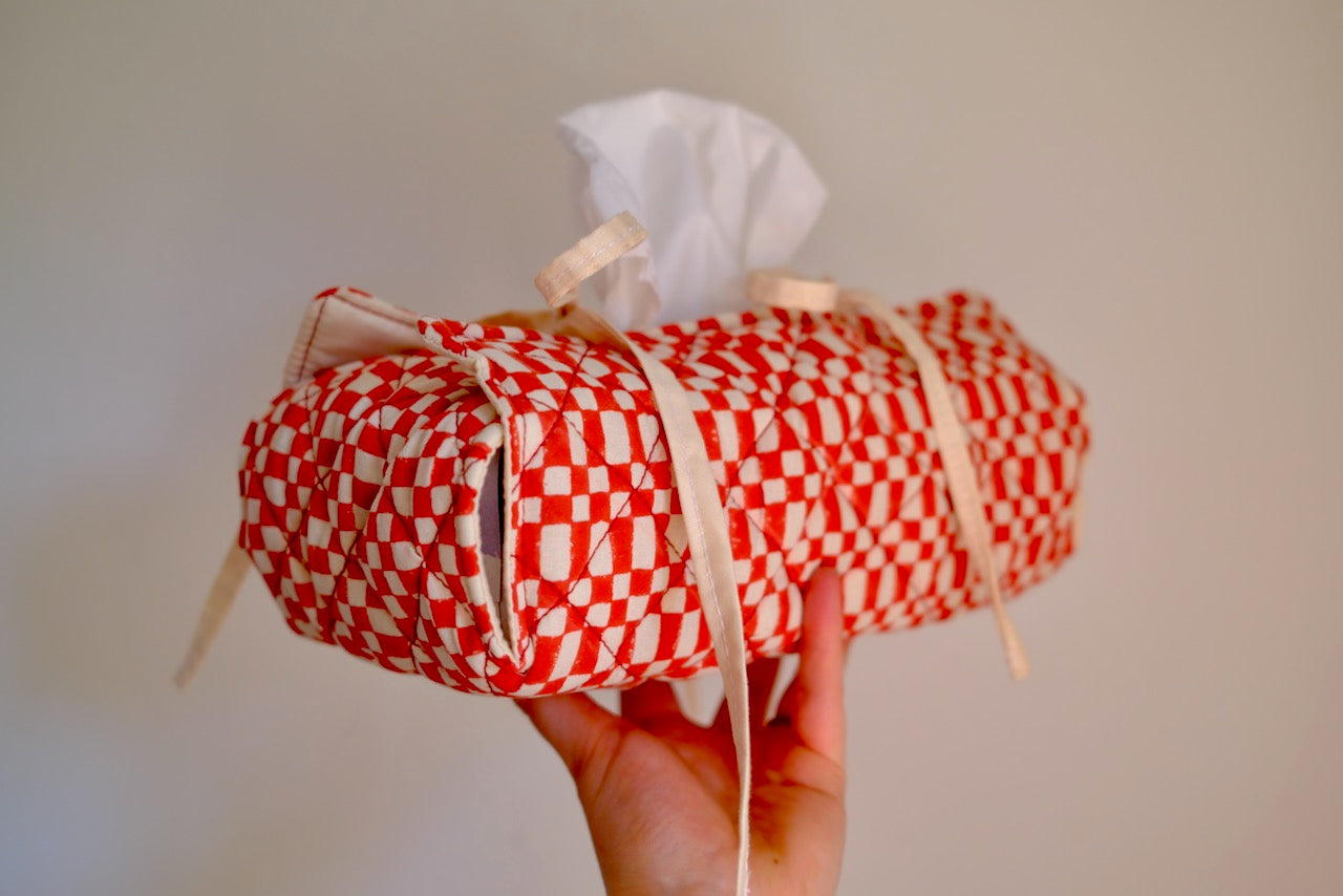 Made with a hand printed cotton, wadding and then lined with rescued curtain lining. Quilted with red thread in a diamond pattern. Photographed with a standard tissue box inside.