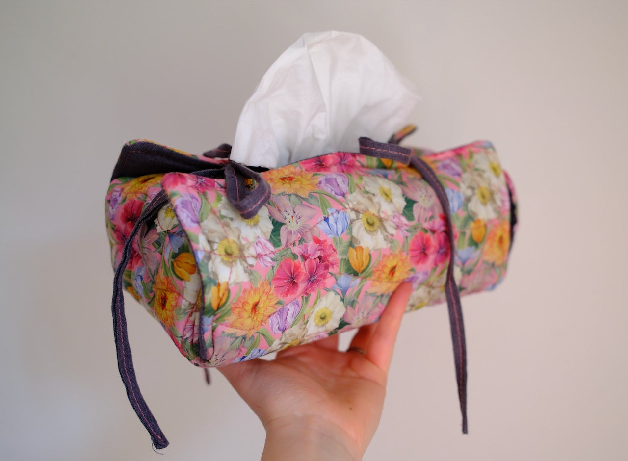 Made with Melody Bloom Liberty print tana lawn cotton, wadding and then lined with grey linen. The quilting is a wavy diamond pattern. Photographed with a standard tissue box inside.